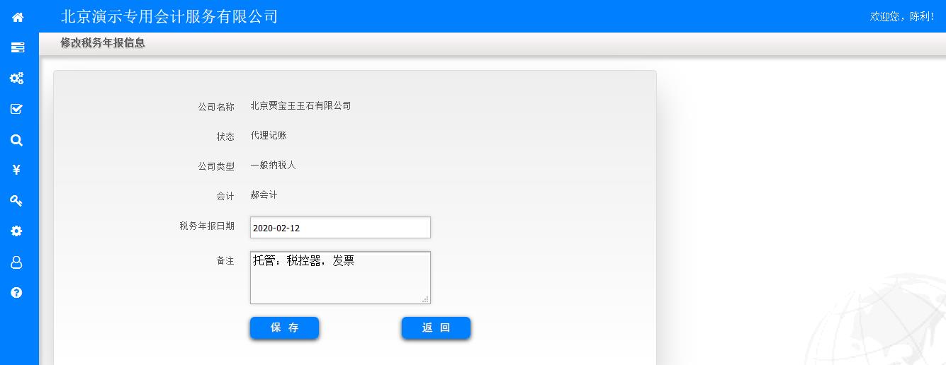 完成:点击“完成”,税务年报日期修改为明年1月1日,并记录税务年报记录和操作人信息,以便将来查询。可以在查询管理 -> 税务年报查询以前的税务年报记录。